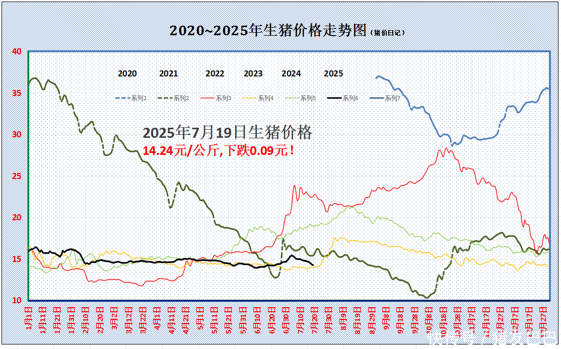 据数据显示,截至7月19日,全国外三元标猪均价14.24元/公斤,猪价环比昨日下降0.09元,相比月初累计下降1.16元,猪价跌猛了,月内冲高回落,猪价累计下降7.5%!