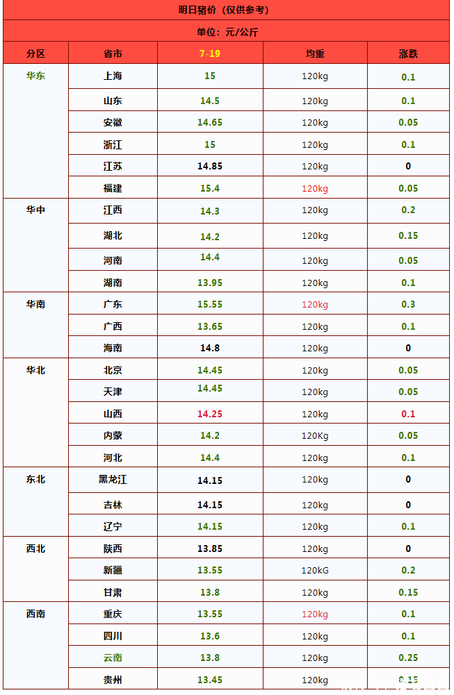 在南方市场,西南、华东、华中以及华南地区,屠企报价大部下跌,主流降价幅度在0.05-0.2元,川渝报价跌至13.55元/公斤,云贵报价跌至13.45-13.8元/公斤,山东以及安徽报价在14.5-14.65元,江浙地区报价14.85-15元,河南报价在14.4元,两湖地区报价跌至13.95-14.2元/公斤,在华南地区,两广报价在13.65-15.55元/公斤!